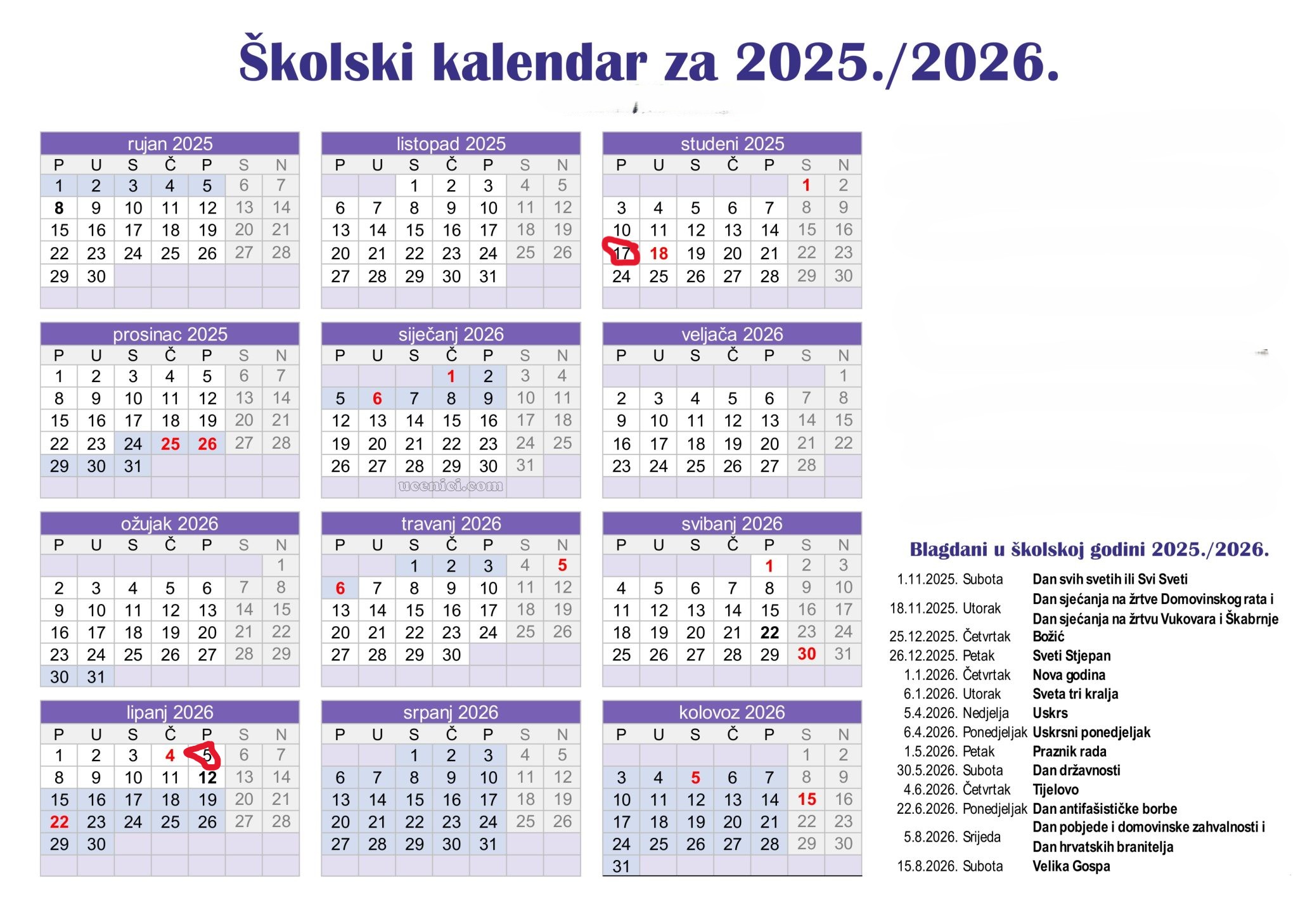 Nenastavni radni dani: 17.10.- stručno usavršavanje djelatnika , 5.6. – stručna ekskurzija djelatnika