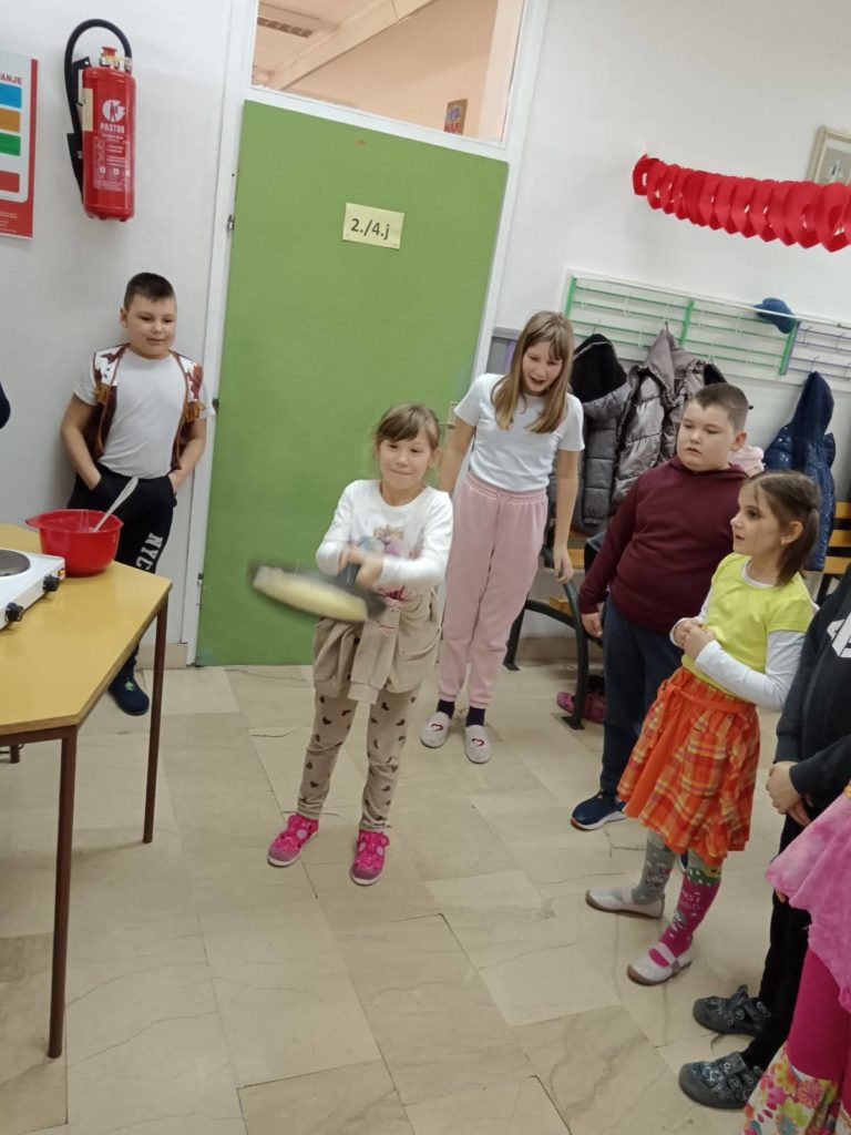 Tijekom aktivnosti učenici su naučili nazive za potrebne sastojke i kuhinjsko posuđe na engleskom jeziku, a zatim su zajednički pripremili smjesu. Svaki je učenik samostalno izlio smjesu u tavu, pažljivo ispekao palačinku te je, uz malo hrabrosti i smijeha, preokrenuo bacivši je u zrak – pravi mali flip izazov!