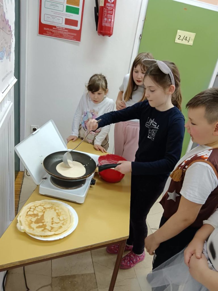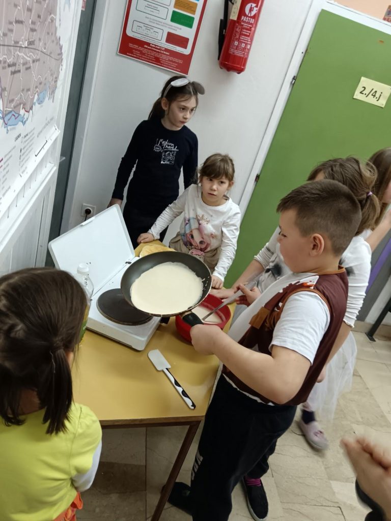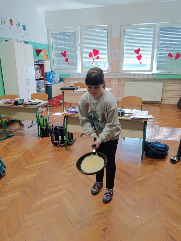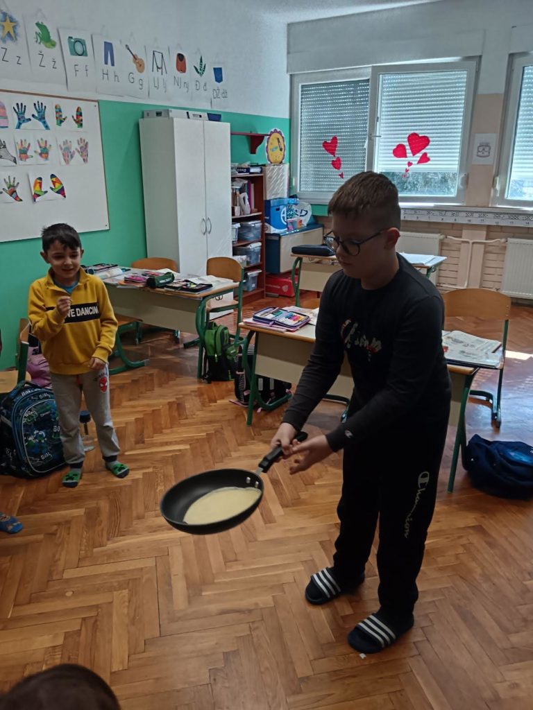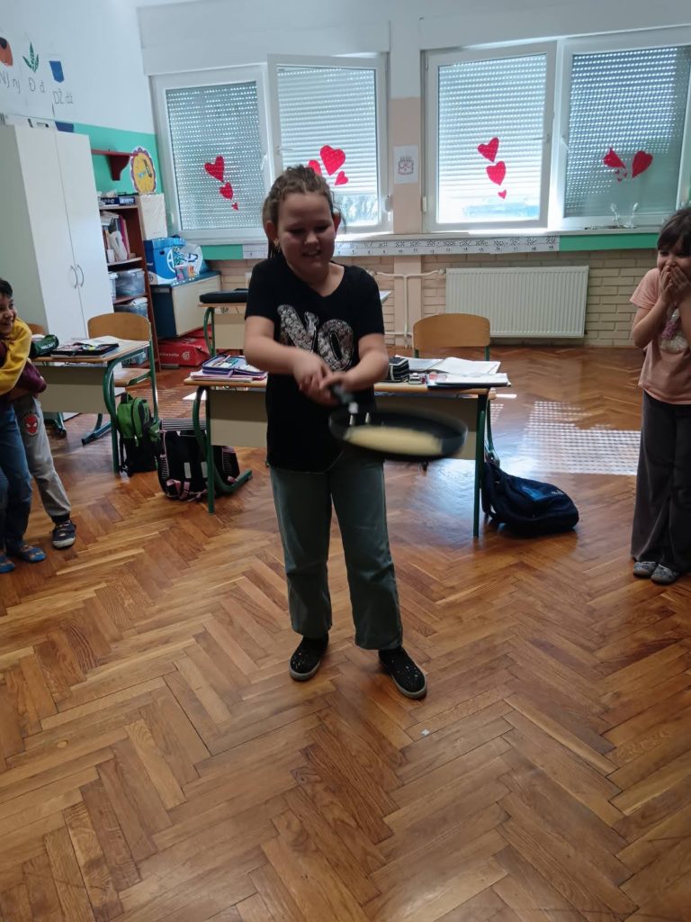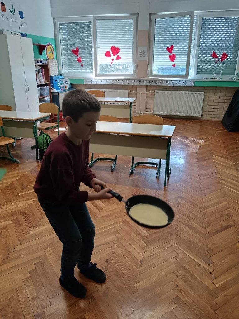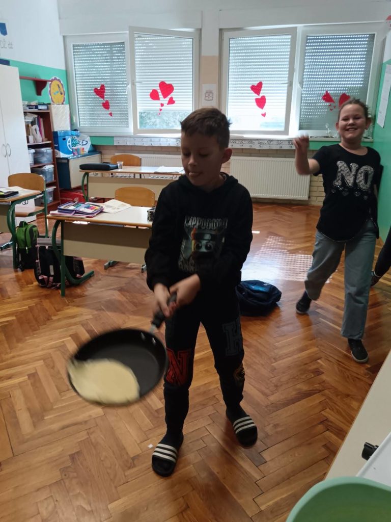 Tijekom aktivnosti učenici su naučili nazive za potrebne sastojke i kuhinjsko posuđe na engleskom jeziku, a zatim su zajednički pripremili smjesu. Svaki je učenik samostalno izlio smjesu u tavu, pažljivo ispekao palačinku te je, uz malo hrabrosti i smijeha, preokrenuo bacivši je u zrak – pravi mali flip izazov!